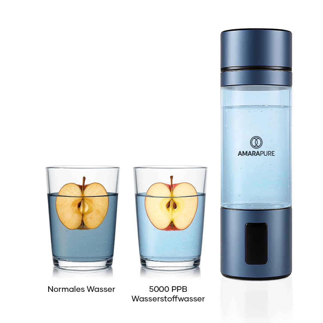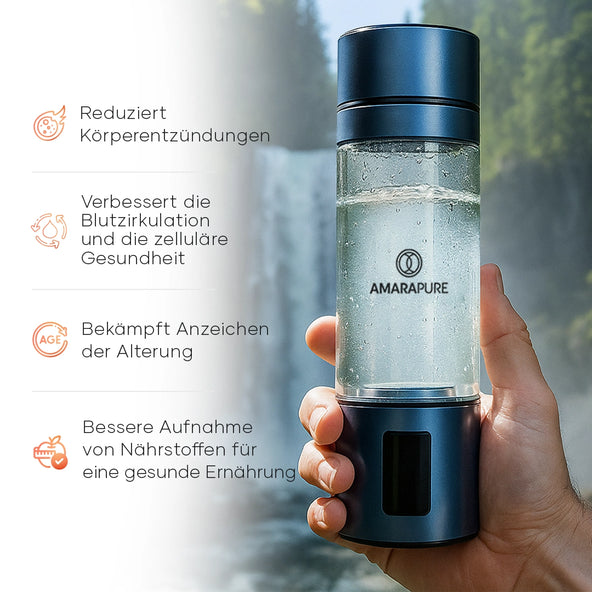 Entfesseln Sie die Kraft des Wassers. Der AmaraPure™ Aman reichert Ihr Trinkwasser in nur 3 Minuten mit molekularem Wasserstoff an – für mehr Energie, schnellere Regeneration und tiefgehende Zellpflege. Kompakt, stilvoll und immer griffbereit.