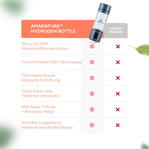 Amarapure nutzt fortschrittliche Elektrolysetechnologie, um Wasser effizient mit Wasserstoffgas anzureichern. Jede Flasche ist so konzipiert, dass sie unter optimalen Bedingungen funktioniert und die Wasserstoffkonzentration maximiert. Unsere Produkte werden von der International Hydrogen Standards Association (IHSA) unabhängig geprüft und übertreffen die Industriestandards für Sicherheit und Wasserstoffkonzentration.