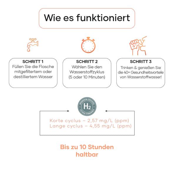 - Schnelle Produktion – Wasserstoffreiches Wasser innerhalb weniger Minuten fertig.