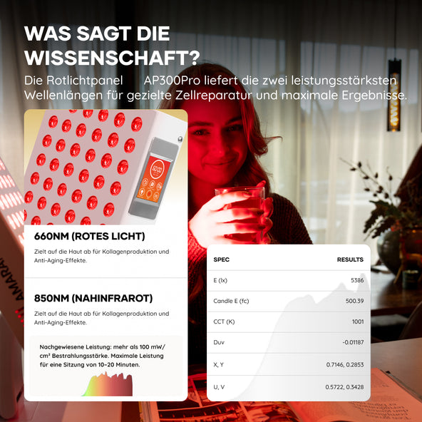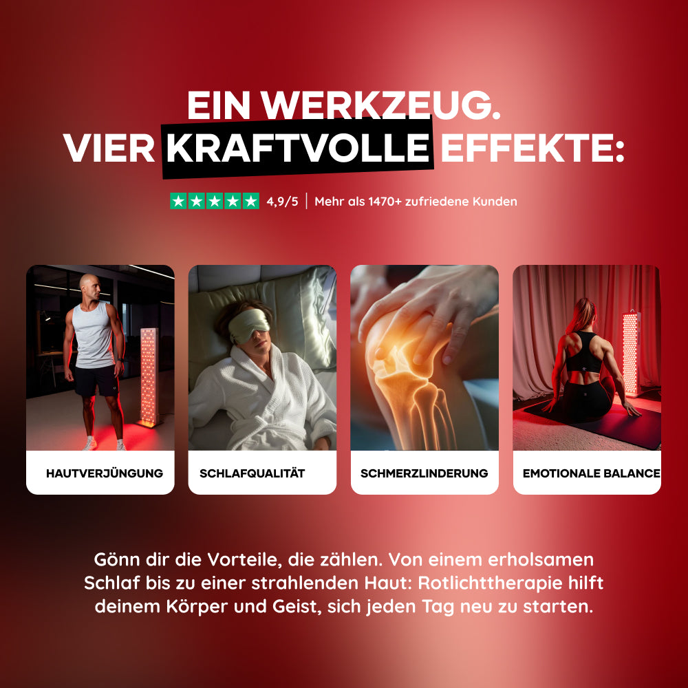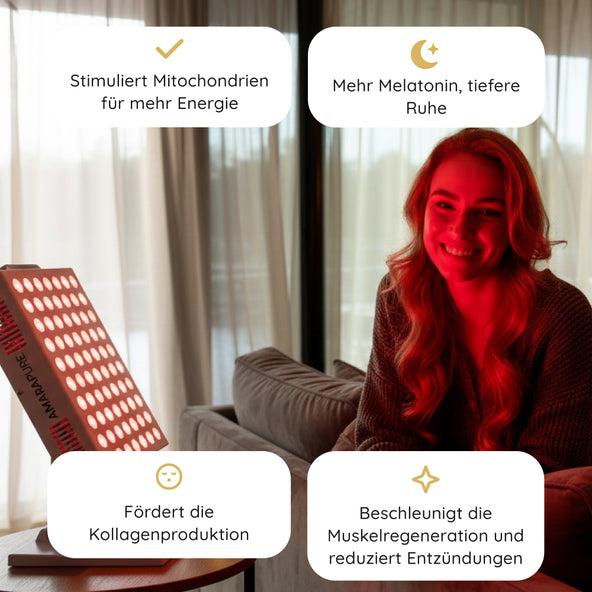 Leistungsstarke Rotlichttherapie für zu Hause, die Ihre Haut, Regeneration und Energie unterstützt.