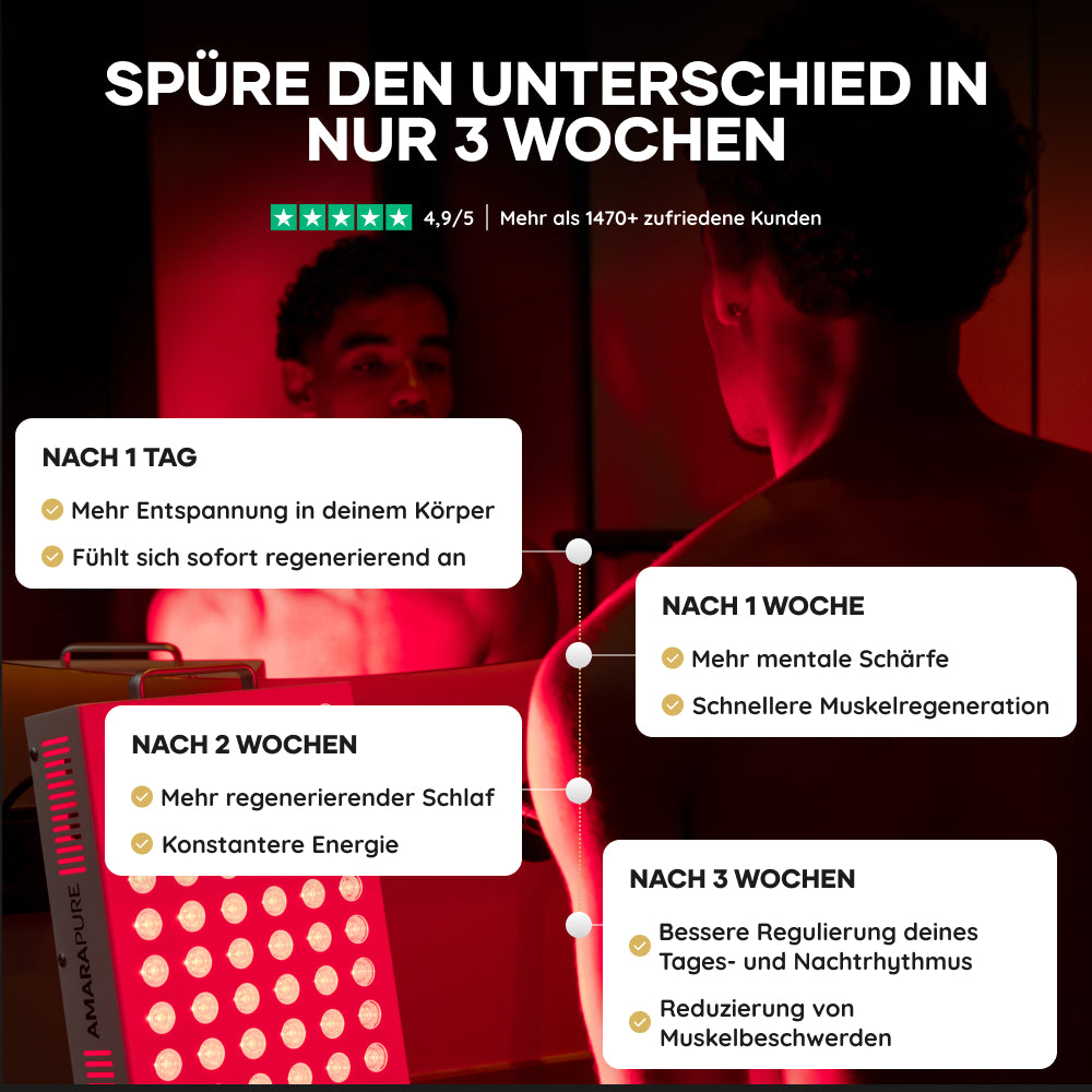 - Mehr Energie & besserer Schlaf Bei regelmäßigen Sitzungen können bereits kurze tägliche Behandlungen einen Unterschied machen.