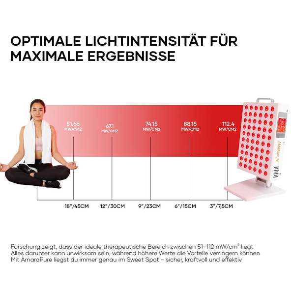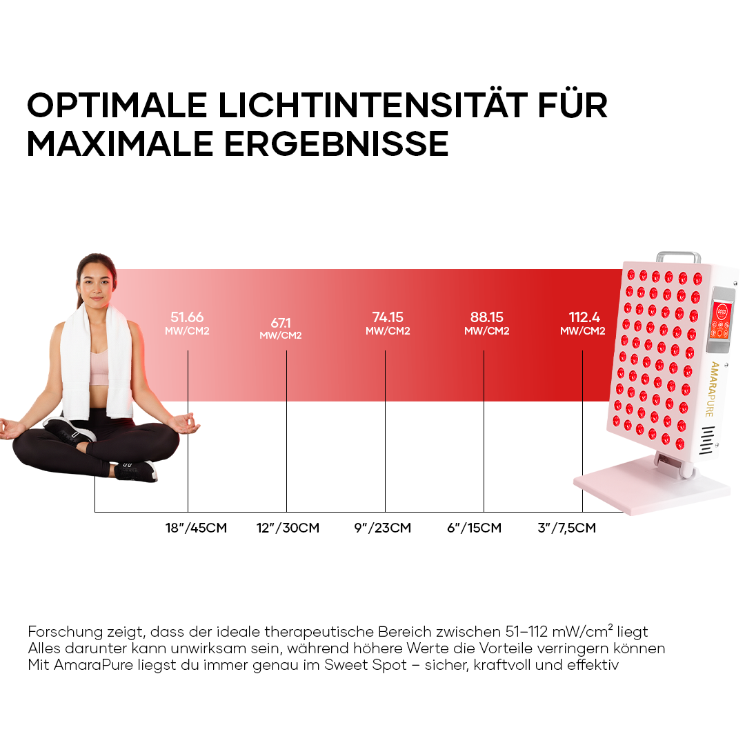 - Entfernung & Dauer: Beginnen Sie mit 5–10 Minuten pro Zone und steigern Sie sich auf 10–20 Minuten pro Bereich. Halten Sie gemäß der Gebrauchsanweisung einen Abstand von 15–45 cm ein. Beginnen Sie mit 3–5 Sitzungen pro Woche.