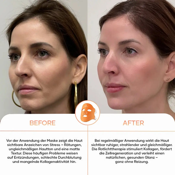 Die Rotlichtmaske stimuliert die Kollagenproduktion und verbessert die Hautstruktur. Ihre Haut fühlt sich straffer, glatter und sichtbar frischer an – jeden Tag aufs Neue.