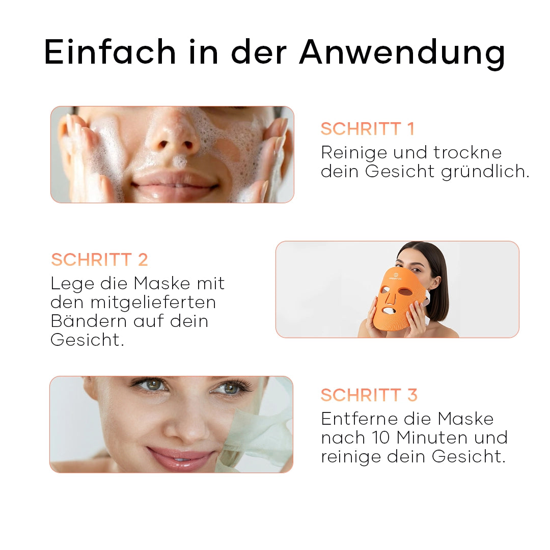 Reinigen Sie Ihr Gesicht → befestigen Sie die Maske → wählen Sie eine Farbe → stellen Sie den Timer ein. Beginnen Sie mit kurzen Sitzungen und testen Sie das Gerät zunächst auf einer kleinen Hautfläche. Die Maske schaltet sich nach Gebrauch automatisch aus.