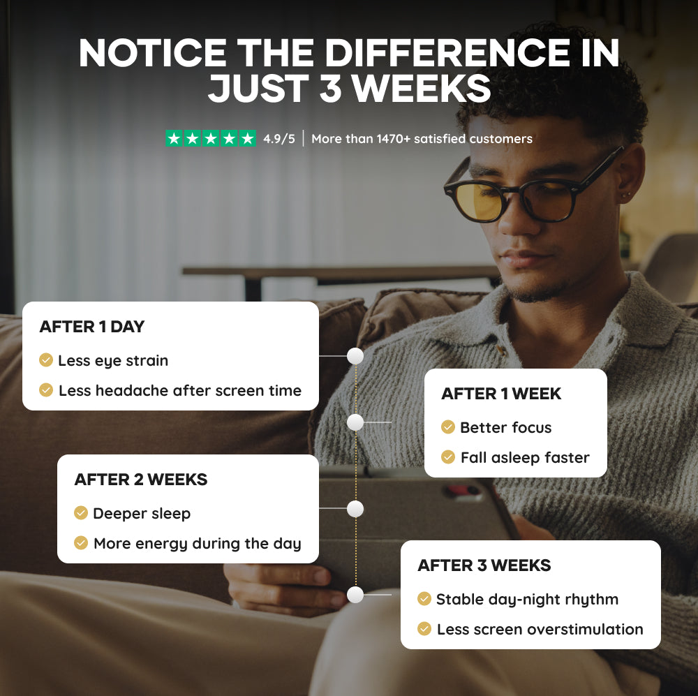 For the best and long-term result Use the glasses consistently. Daily protection ensures optimal biorhythm functioning and structurally reduces digital eye strain.