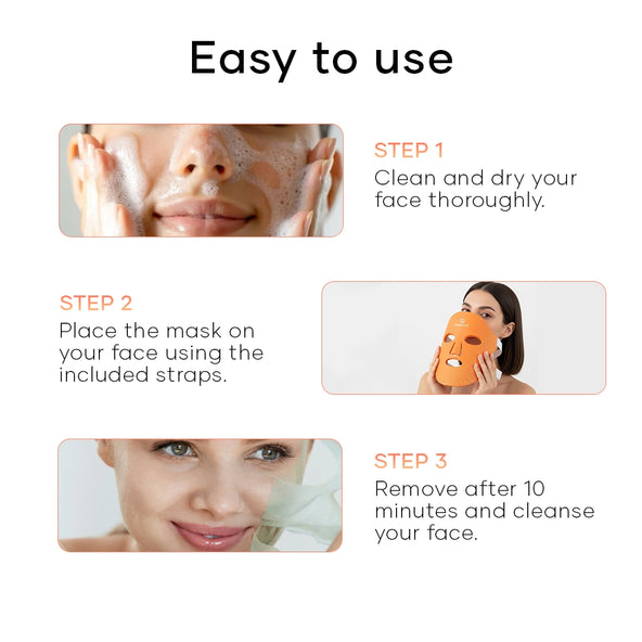 Clean your face → secure the mask → choose a color → set the timer. Start with short sessions and test on a small area of skin first. The mask switches off automatically after use.