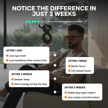 Voor het beste en langdurige resultaat gebruik je de bril consistent. Dagelijkse bescherming garandeert een optimaal functionerend bioritme en vermindert structureel digitale oogstress.