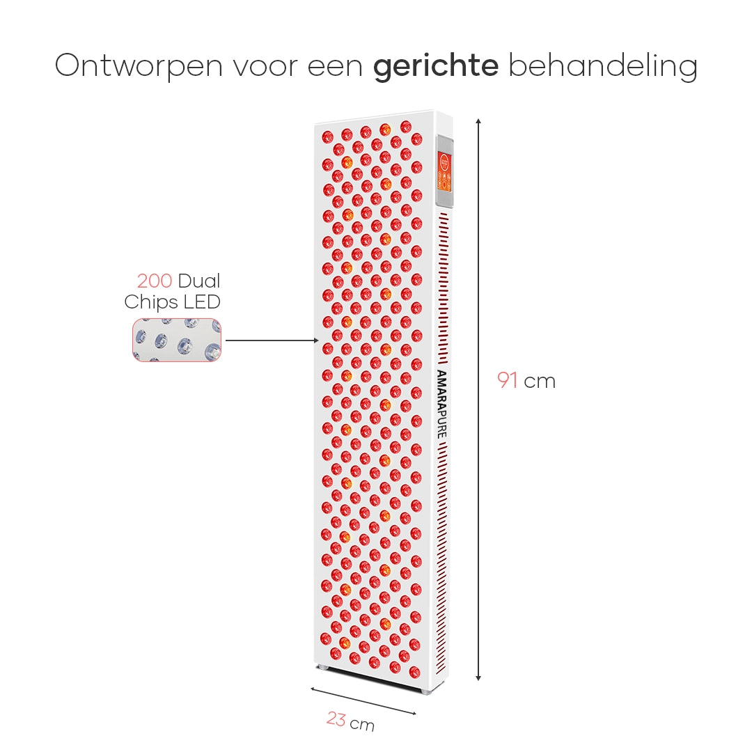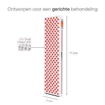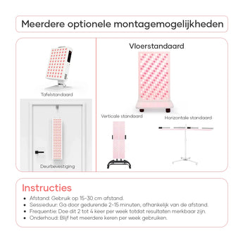 - Afstand & duur: 5–10 minuten per zone als start; bouw op naar 10–20 minuten per gebied. Houd 15–45 cm afstand volgens de handleiding. Start met 3–5 sessies per week.