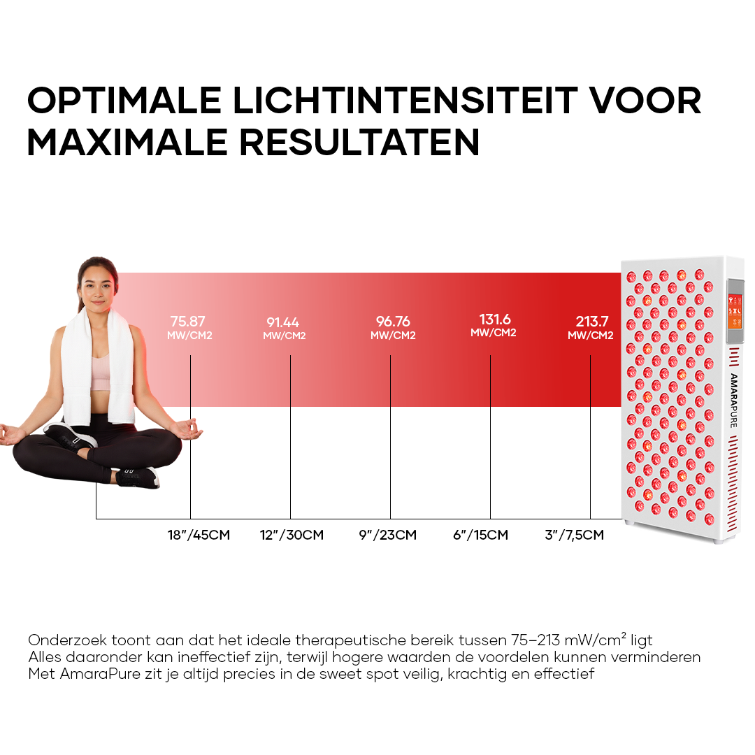 - Afstand & duur: 5–10 minuten per zone als start; bouw op naar 10–20 minuten per gebied. Houd 15–45 cm afstand volgens de handleiding. Start met 3–5 sessies per week.