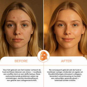 Roodlichttherapie helpt de huid te revitaliseren door de aanmaak van collageen te stimuleren, ontstekingen te verminderen en de bloedsomloop te verbeteren. Regelmatig gebruik kan bijdragen aan een gladdere, stevigere huid en helpt bij het verminderen van fijne lijntjes, littekens, acne en pigmentvlekken.