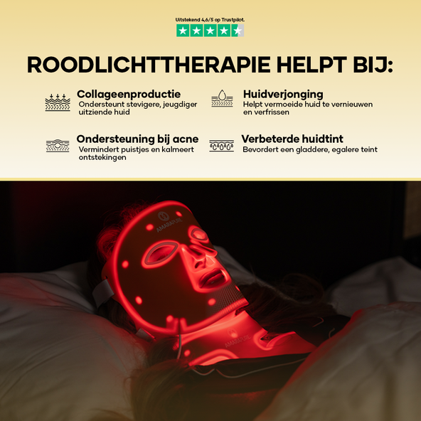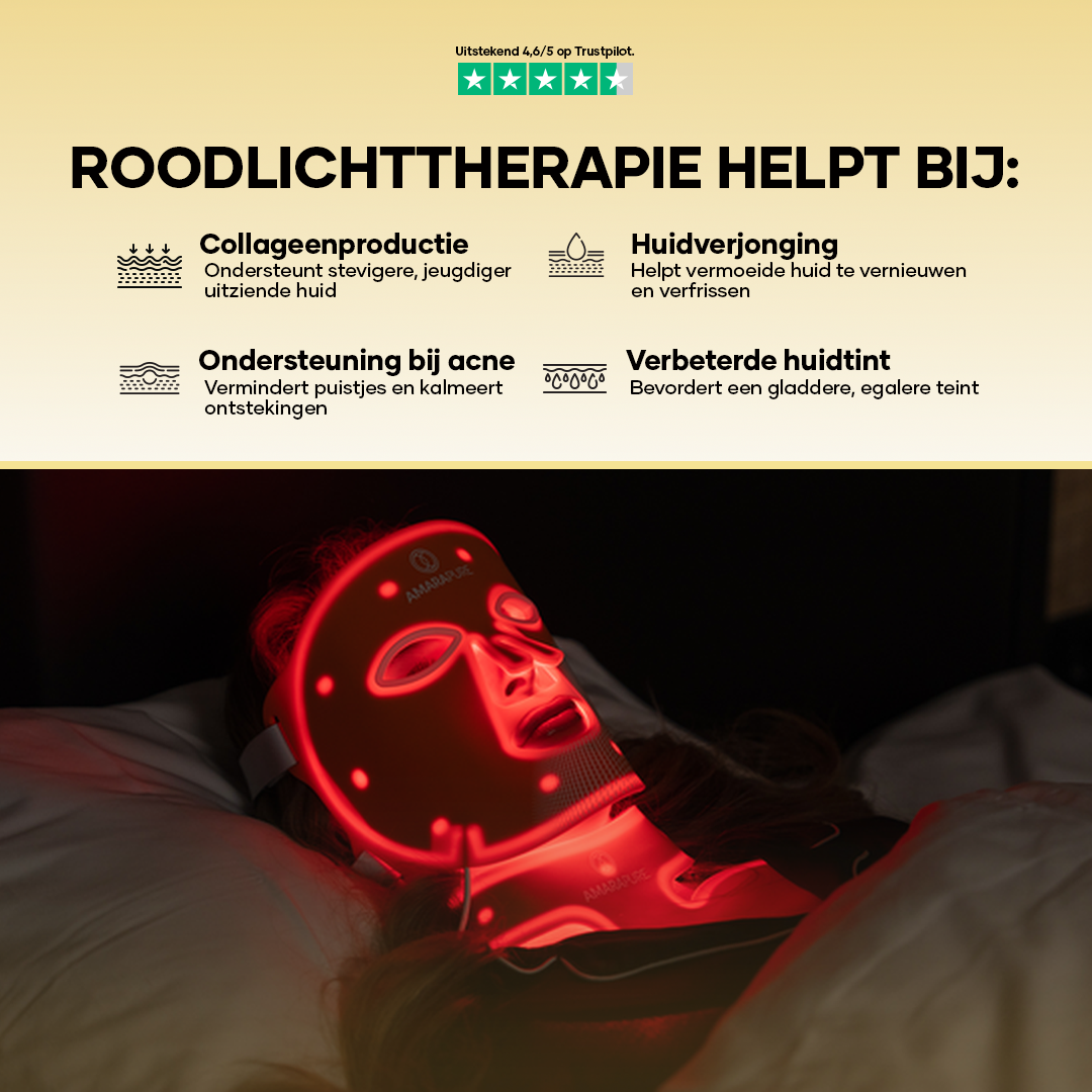 Rödljusterapi stimulerar kollagenproduktion och förbättrar elasticitet av huden. Detta minskar fina linjer, rynkor och en matt hy — för en synlig glattere och fastare hud.